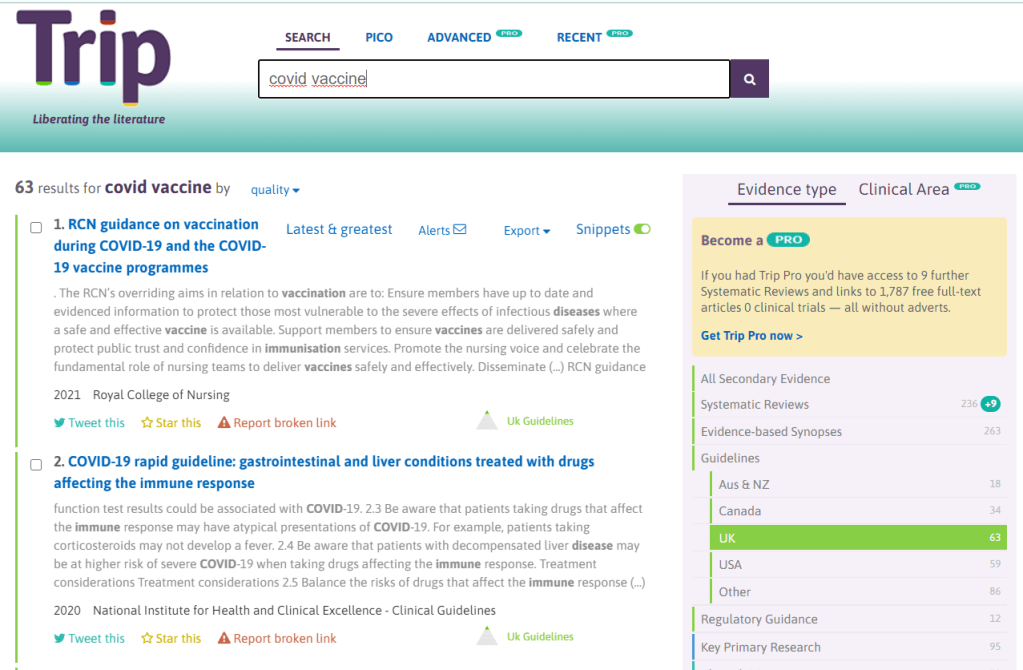 Los cambios los encontramos en la página de resultados, donde el filtro por tipo de evidencia se sitúa ahora a la izquierda de la página. En el Trip actual el resultado a nuestra búsqueda «COVID VACCINE» nos mostraba la siguiente página de resultados: