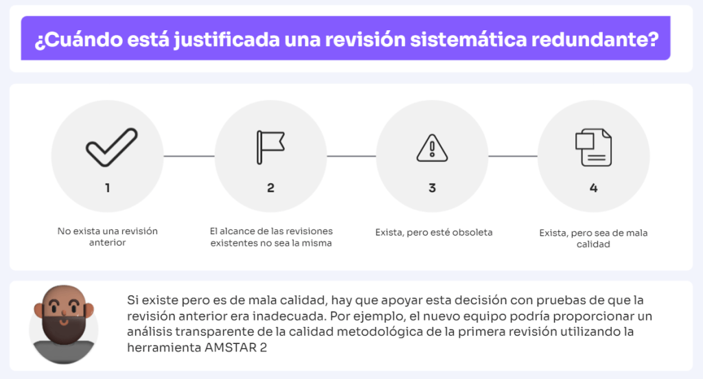 Solo en los casos de que: 1) el alcance de las revisiones existentes no sea la misma; 2) no exista una revisión anterior; 3) exista, pero esté obsoleta (podríamos decidir actualizarla desde la fecha de la revisión anterior); o 4) exista, pero sea de mala calidad, tendría justificación hacer una nueva revisión. En ese caso, el otro equipo puede decidir abordar ese tema de nuevo con métodos adecuados. Tales casos deben justificarse adecuadamente en la nueva revisión, apoyando esta decisión con pruebas de que la revisión anterior era inadecuada. Por ejemplo, el nuevo equipo podría proporcionar un análisis transparente de la calidad metodológica de la primera revisión utilizando la herramienta AMSTAR 2 (2), con los detalles de este análisis reportados en un archivo suplementario.