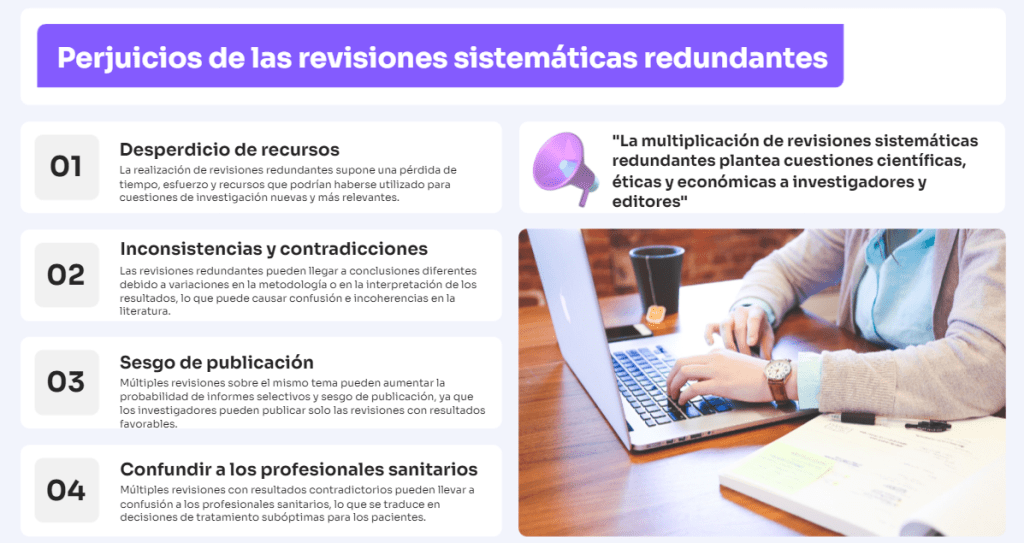 1. Desperdicio de recursos: La realización de revisiones redundantes supone una pérdida de tiempo, esfuerzo y recursos que podrían haberse utilizado para cuestiones de investigación nuevas y más relevantes.
