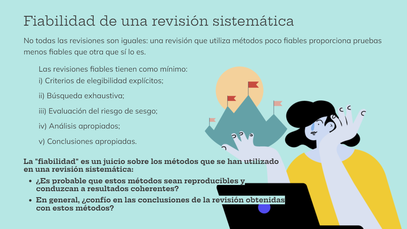 No todas las revisiones son iguales: una revisión que utiliza métodos poco fiables proporciona pruebas menos fiables que otra que sí lo es. La «fiabilidad» es un juicio sobre los métodos que se han utilizado en una revisión sistemática: ¿Es probable que estos métodos sean reproducibles y conduzcan a resultados coherentes?, En general, ¿confío en las conclusiones de la revisión obtenidas con estos métodos?