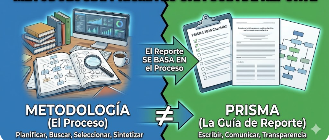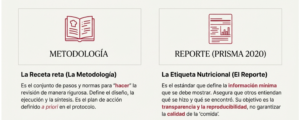 - La Metodología es la «receta»: El procedimiento detallado (Cochrane, JBI) sobre cómo se diseña y ejecuta la revisión.