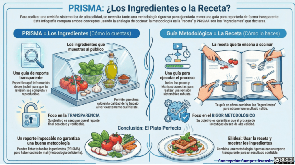 - PRISMA son los «ingredientes»: La información mínima que debe mostrar la revisión sistemática que permite a otros entender, evaluar y reproducir tu trabajo.