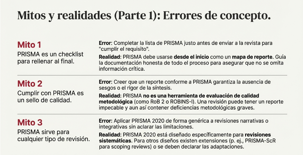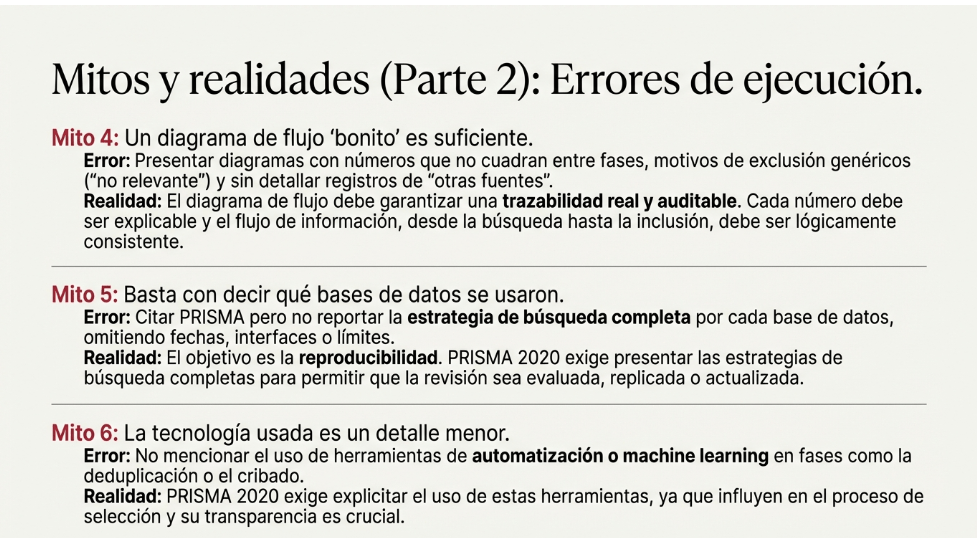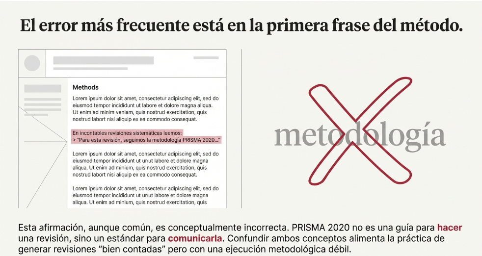 En artículos es frecuente leer “seguimos PRISMA” como si describiera cómo se ejecutó la revisión. El problema es conceptual: PRISMA 2020 es una guía de reporte, no una guía metodológica para “hacer” revisiones. De hecho, PRISMA 2020 declara explícitamente que no pretende guiar la conducción de la revisión ni evaluar su calidad metodológica. Esta confusión alimenta malas prácticas (y revisiones “bien contadas” pero débilmente ejecutadas).