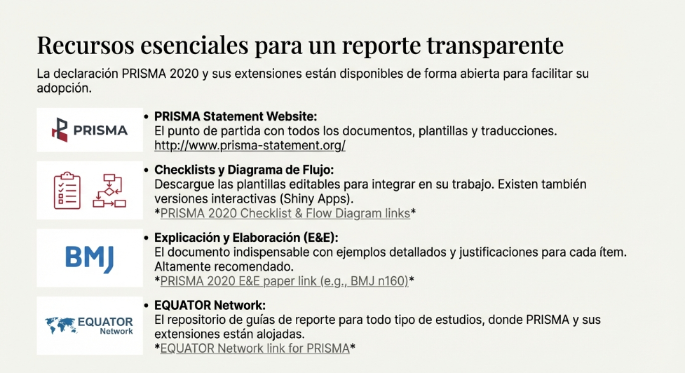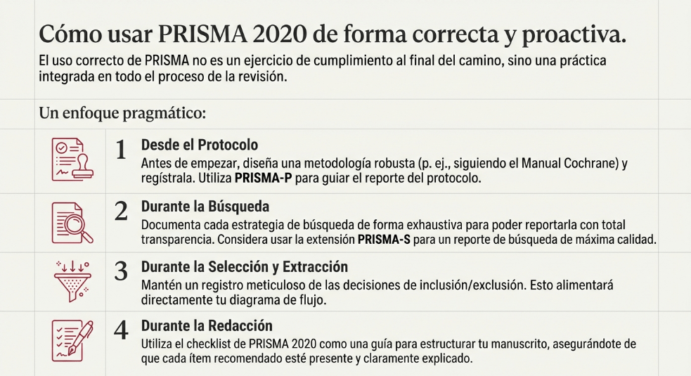 Uso recomendado: no “rellenar casillas” al final, sino usar PRISMA como mapa de documentación desde el protocolo.