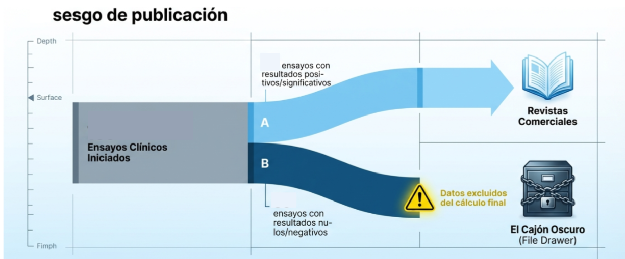 Esto tiene consecuencias directas en la síntesis de la evidencia. Si una revisión incorpora solo estudios publicados en revistas, puede ofrecer una imagen incompleta o sesgada del efecto real de una intervención; dejar fuera determinadas fuentes puede afectar a la estimación final (2). Un ejemplo es el que Man-Son-Hing y cols. encontraron del uso de la quinina para calambres nocturnos: los ensayos publicados reportaron estimaciones de eficacia aproximadamente un 50% mayores que los documentos de la FDA (3). En otro caso, varias revisiones sistemáticas de estudios publicados informaron que la agomelatina era un tratamiento eficaz para la depresión, pero no se demostró ningún efecto del tratamiento cuando se incluyeron siete estudios no publicados. Otros ejemplos de sesgo de publicación incluyen oseltamivir para la influenza en adultos, estatinas para la prevención de eventos tromboembólicos venosos y reboxetina para la depresión (4).