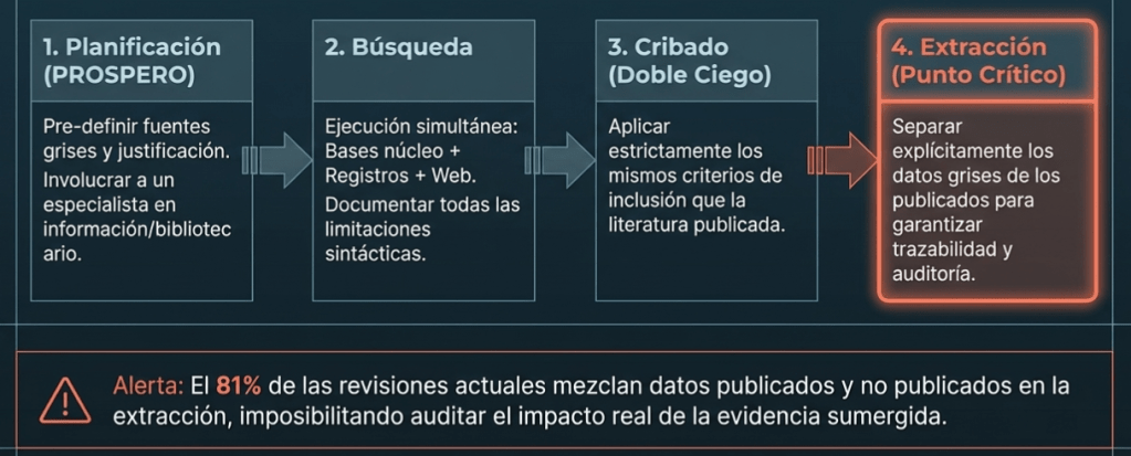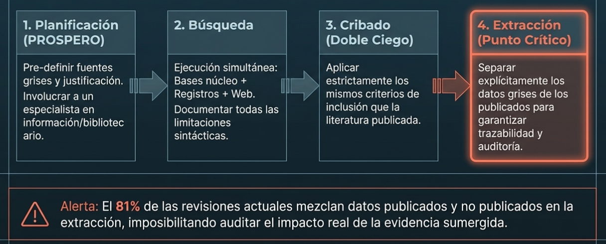 Resulta llamativo que, pese a la importancia metodológica de rastrear literatura gris, algunos manuscritos de revisiones sistemáticas sigan indicando como motivo de exclusión que un estudio no haya sido publicado en una revista con revisión por pares, como si el canal de publicación pudiera sustituir por sí mismo la valoración crítica de su relevancia y su calidad metodológica.