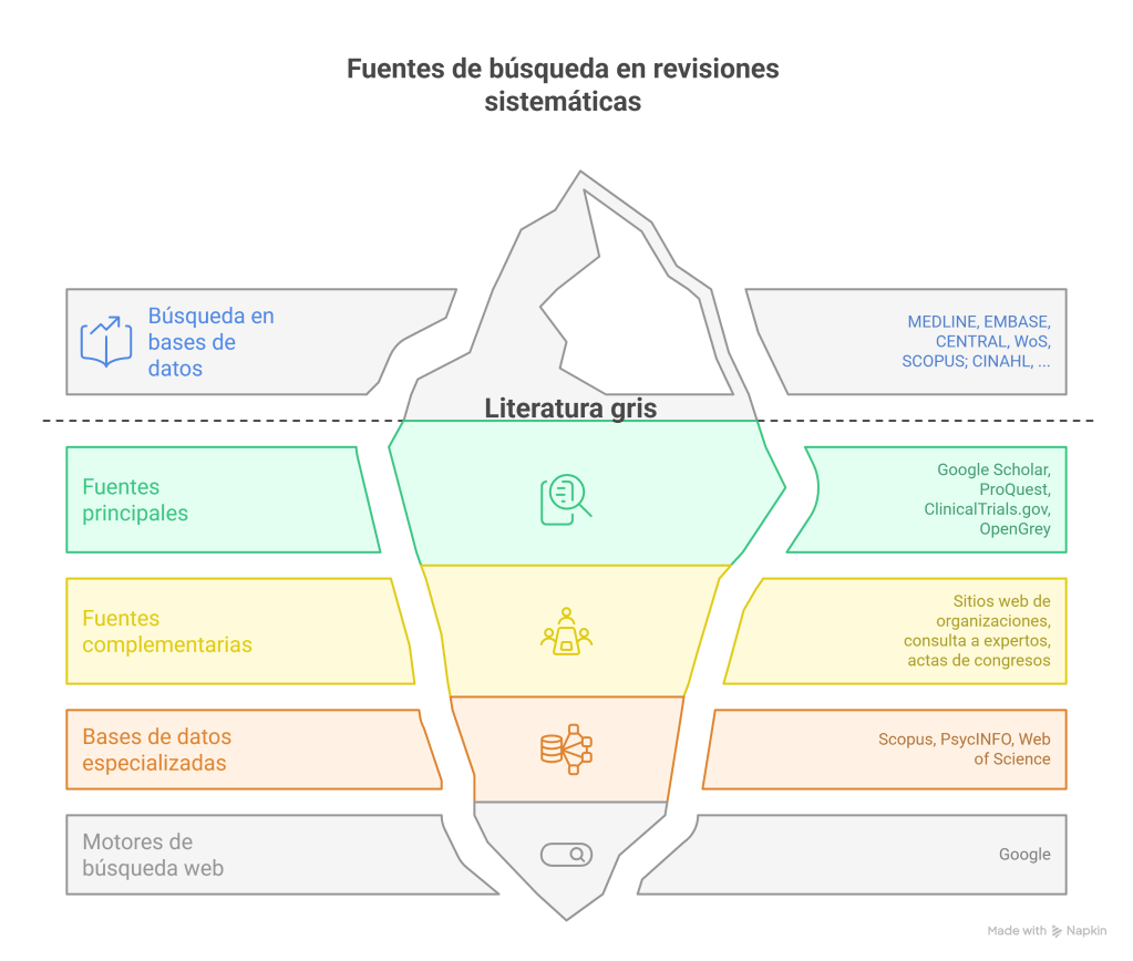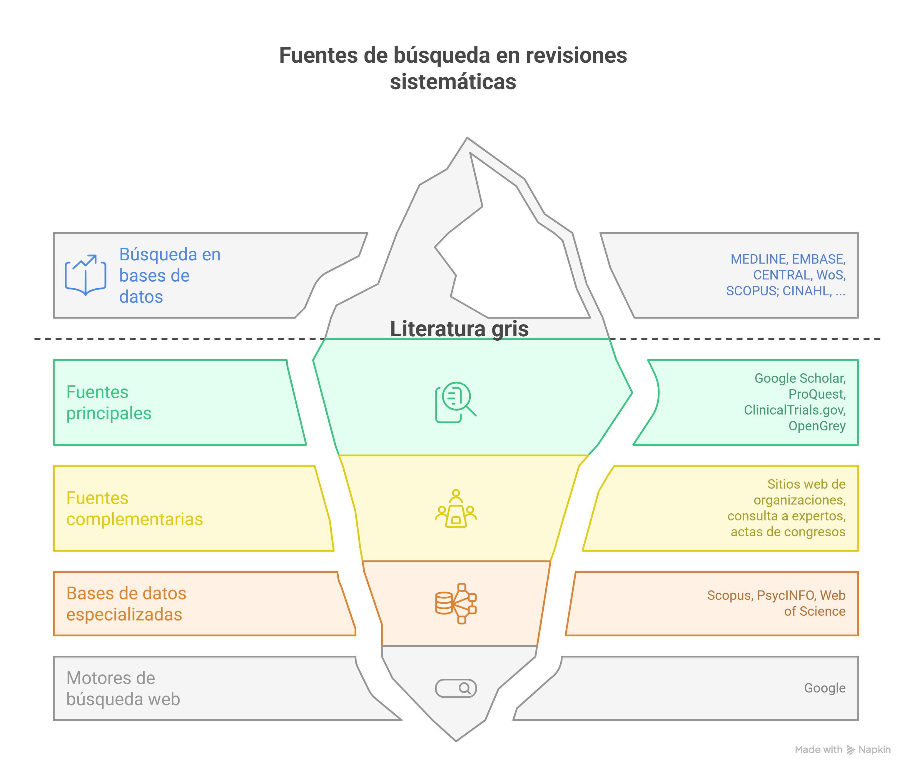 | Fuentes principales a considerar siempre | – Google Scholar: amplia cobertura de literatura académica y gris, pero requiere un cribado cuidadoso debido a su baja precisión; – ProQuest: especialmente útil para tesis y disertaciones; – ClinicalTrials.gov: esencial para identificar datos de ensayos clínicos no publicados; – OpenGrey: específicamente dedicado a literatura gris (aunque actualmente archivado, sigue siendo útil a través de repositorios). |
