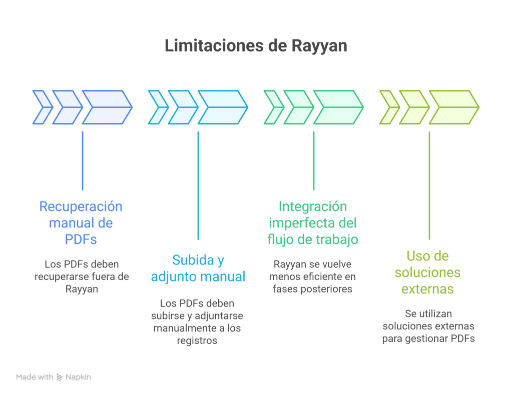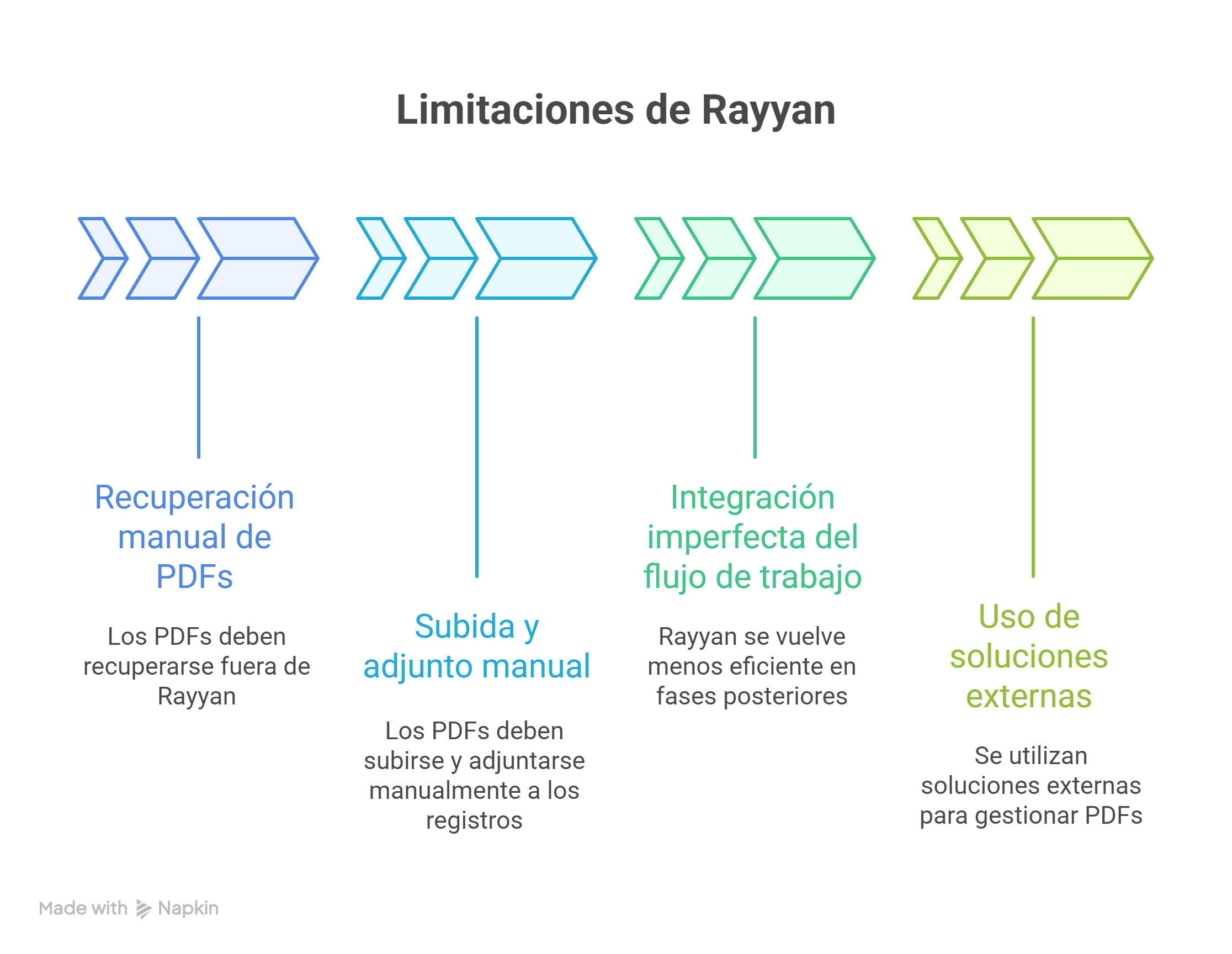 Históricamente, Rayyan se diseñó como herramienta de cribado y, aunque ha ido incorporando módulos posteriores, en la práctica cotidiana se repetían algunos problemas: