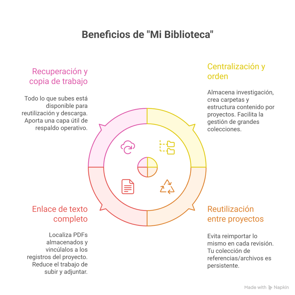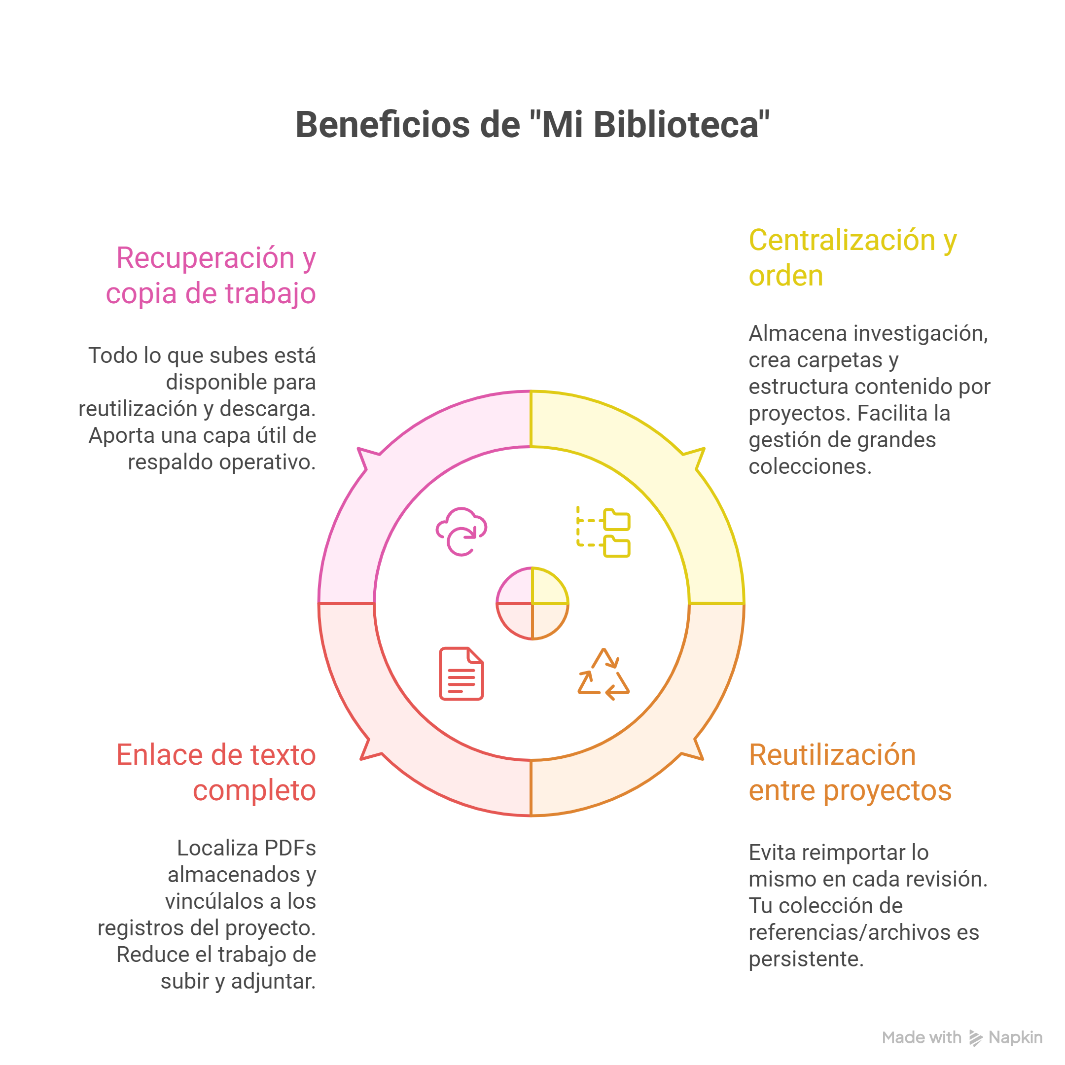 Una idea clave es evitar el “déjà vu” de reimportar lo mismo en cada revisión: “Mi Biblioteca” está pensada para que tu colección de referencias/archivos sea persistente y puedas usar los mismos ítems en revisiones diferentes cuando lo necesites.