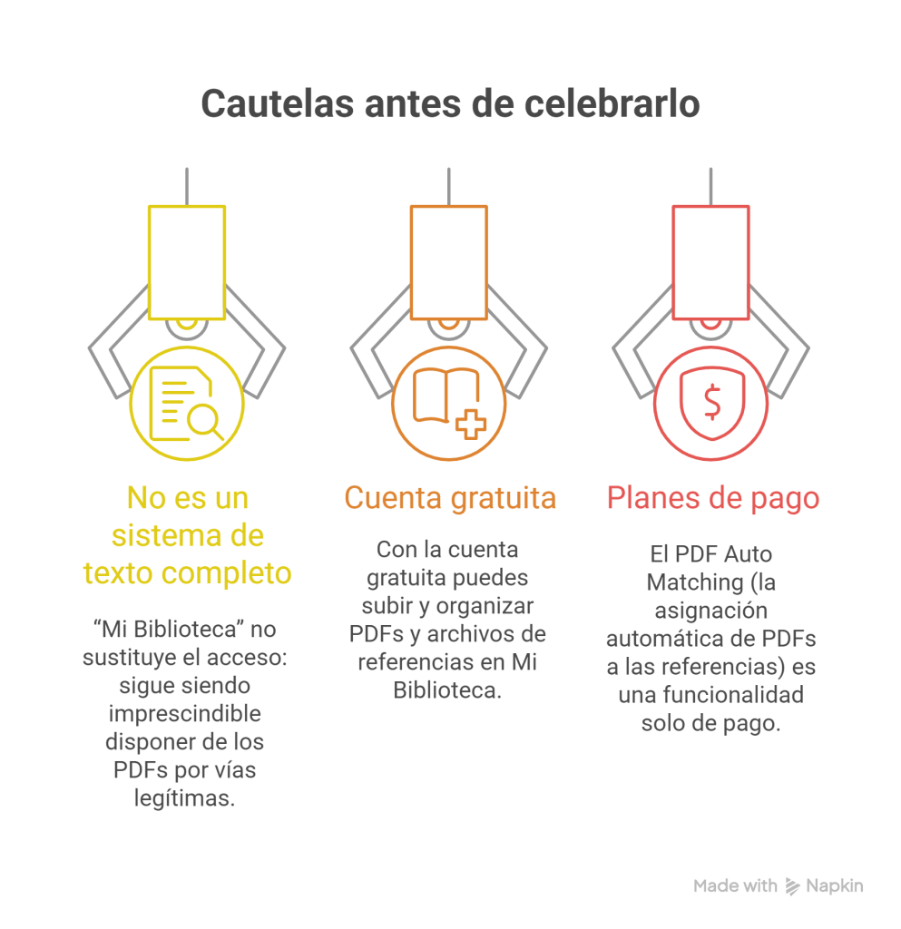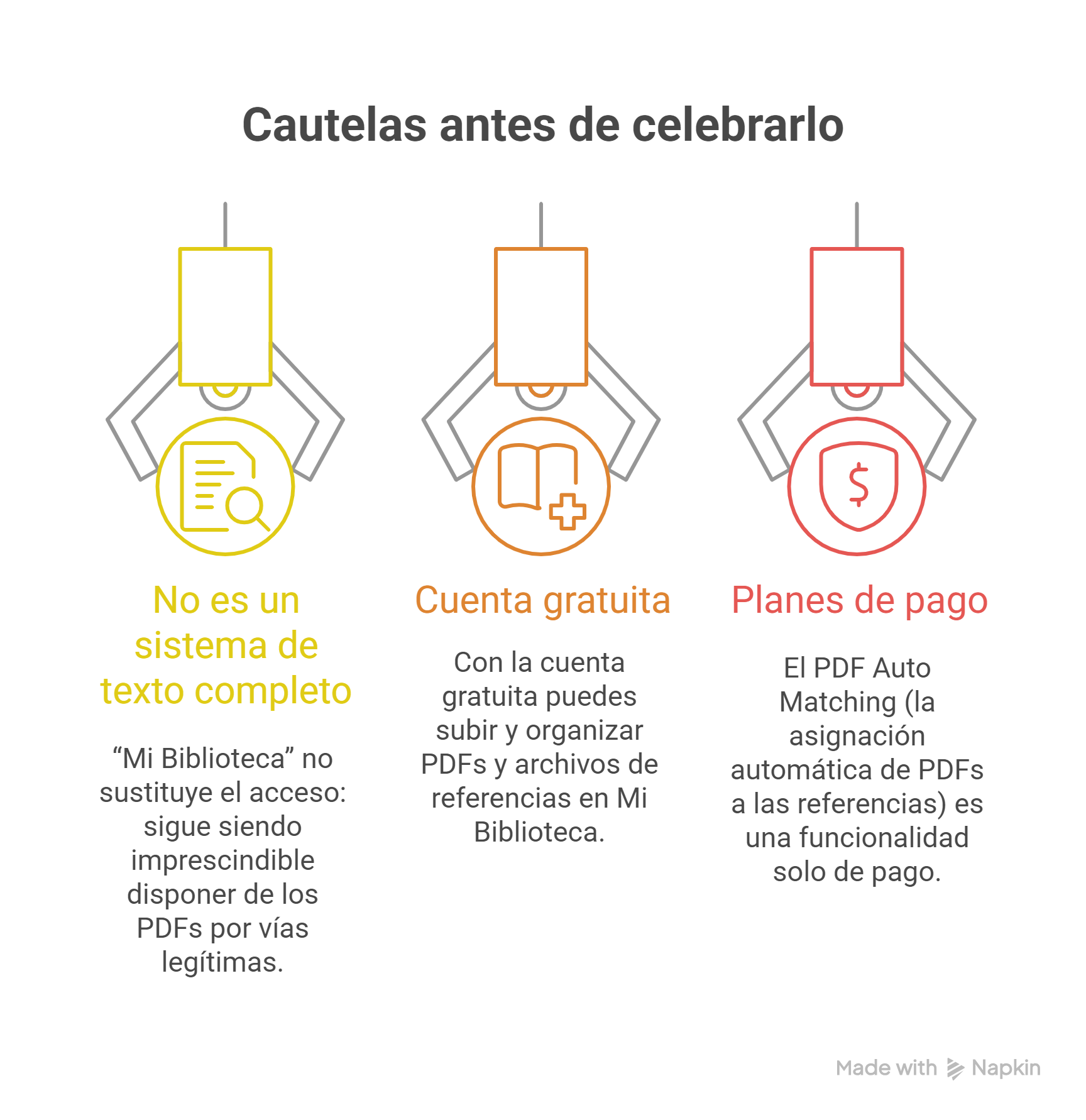 - No es un sistema de obtención de texto completo: “Mi Biblioteca” no sustituye el acceso: sigue siendo imprescindible disponer de los PDFs por vías legítimas (suscripción institucional, OA, solicitud a autores, etc.).