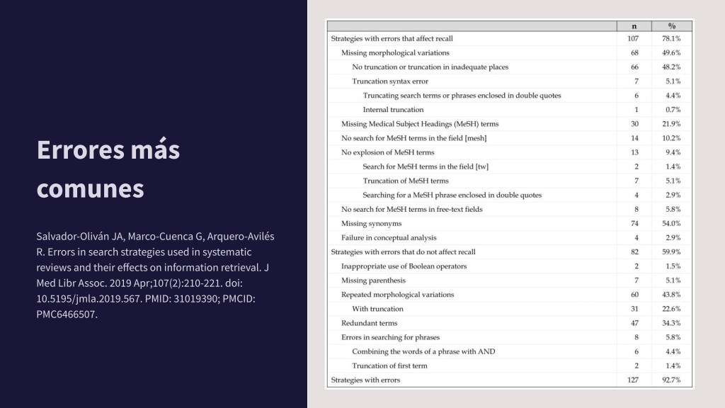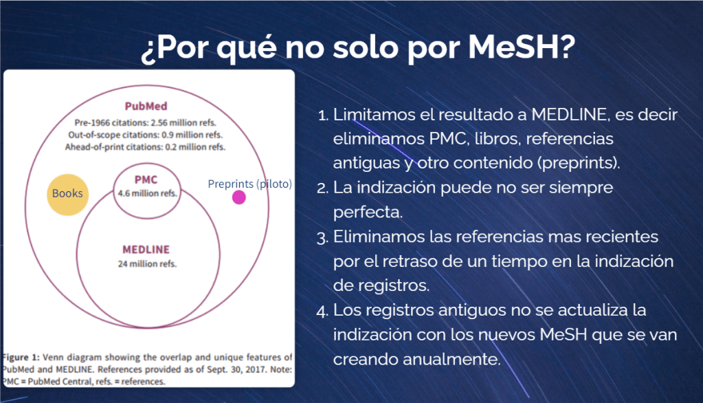 Aunque la búsqueda por el MeSH siempre es más precisa, no siempre es suficiente. Así, si el objetivo de nuestra búsqueda es localizar de forma exhaustiva toda la información de un tema, deberemos combinar la búsqueda del tesauro con el lenguaje natural. En la siguiente imagen vemos algunas de las causas:
