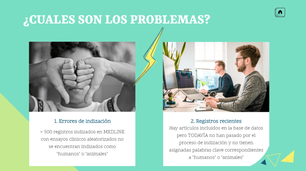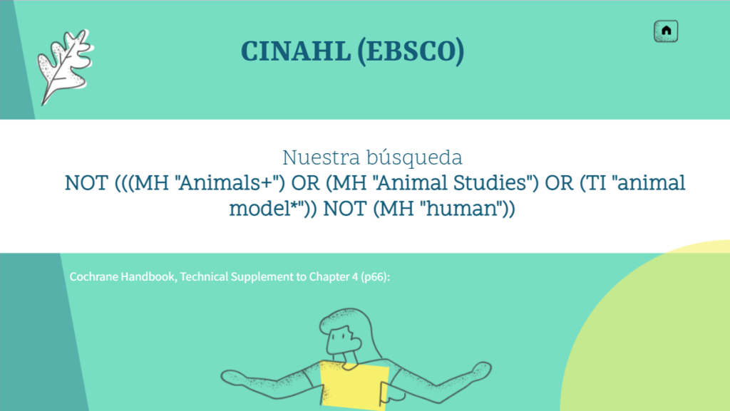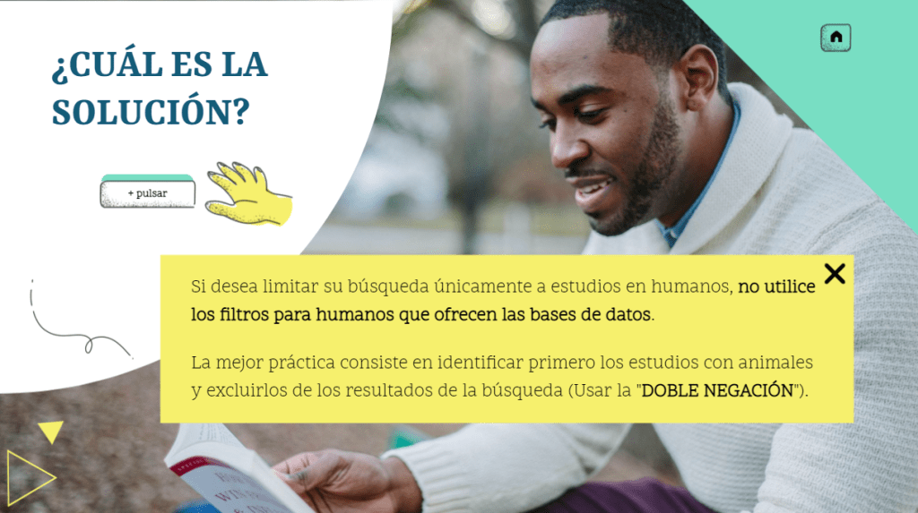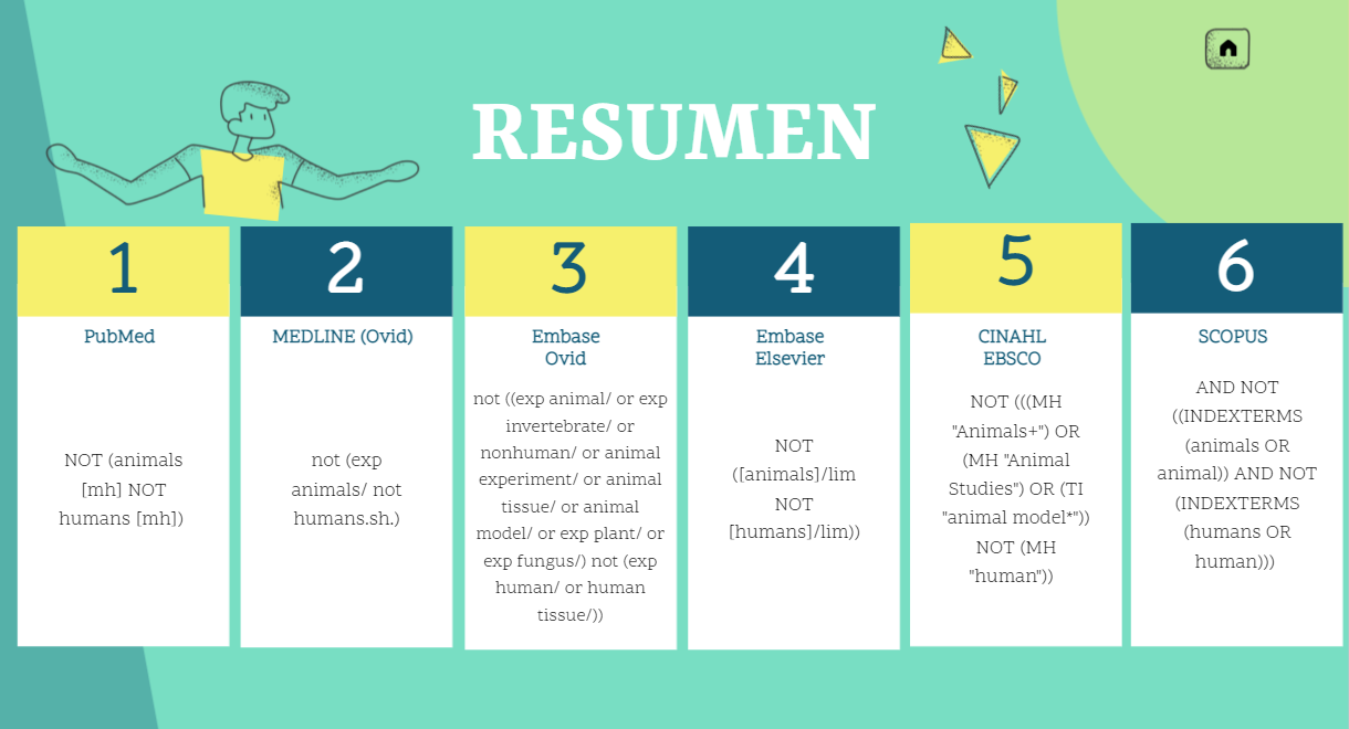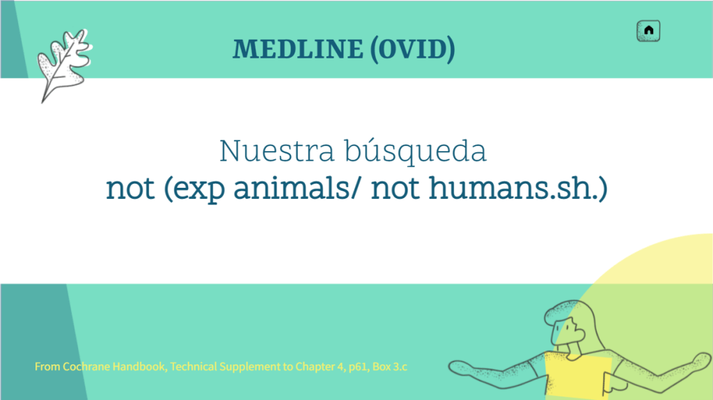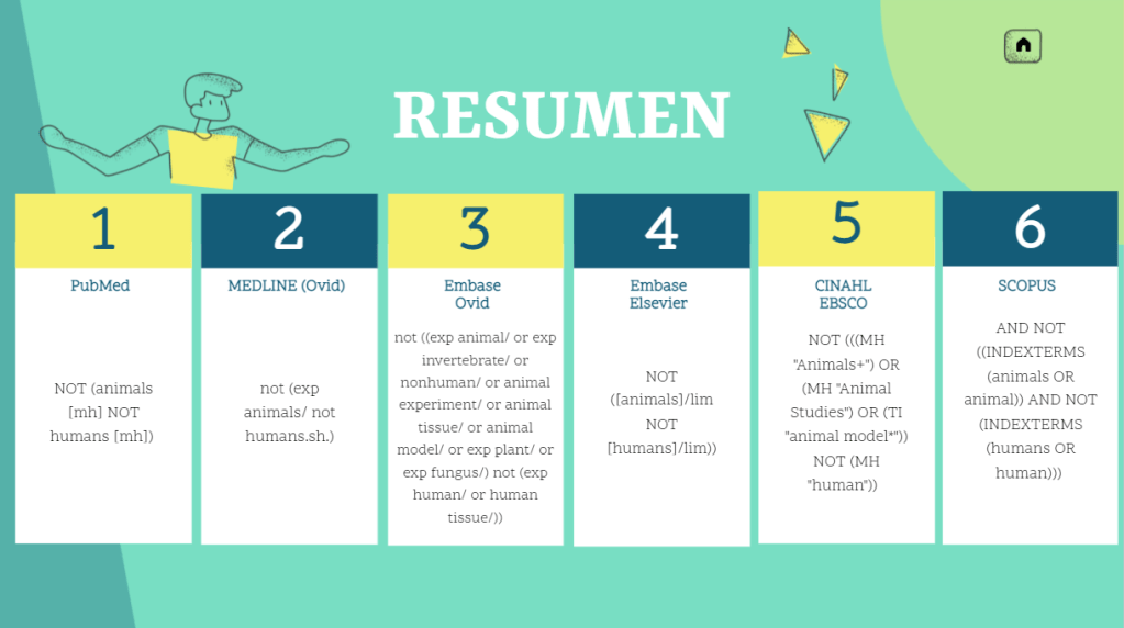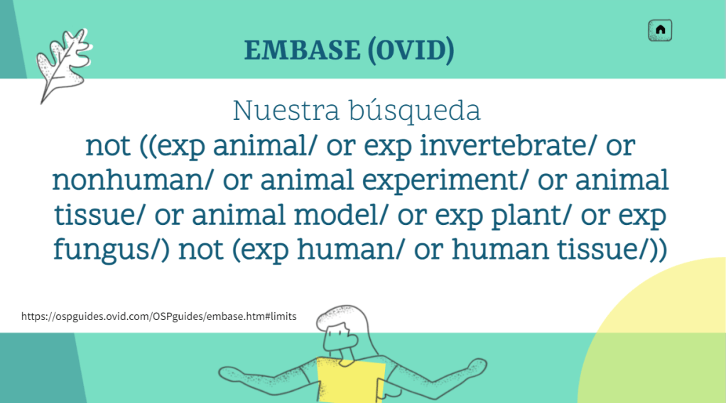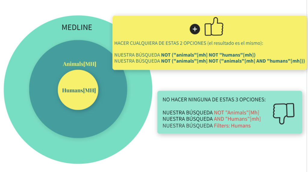 La mejor práctica consiste en identificar primero los estudios con animales y excluirlos de los resultados de la búsqueda (Usar la «DOBLE NEGACIÓN»).