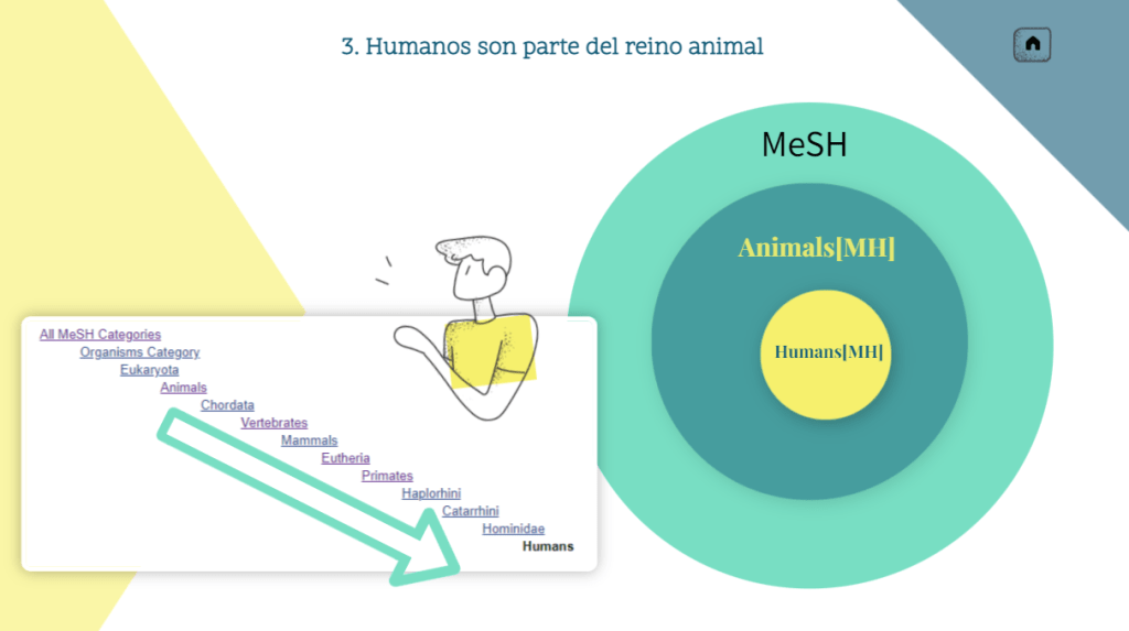 Pero es que, además, un hecho que muchas veces no tenemos en cuenta es que los humanos formamos parte del reino animal. Por lo tanto, la búsqueda por «Animals»[MeSH] recupera también los artículos asignados con los descriptores más específicos situados debajo de este árbol. Es decir, recuperaríamos también los humanos.