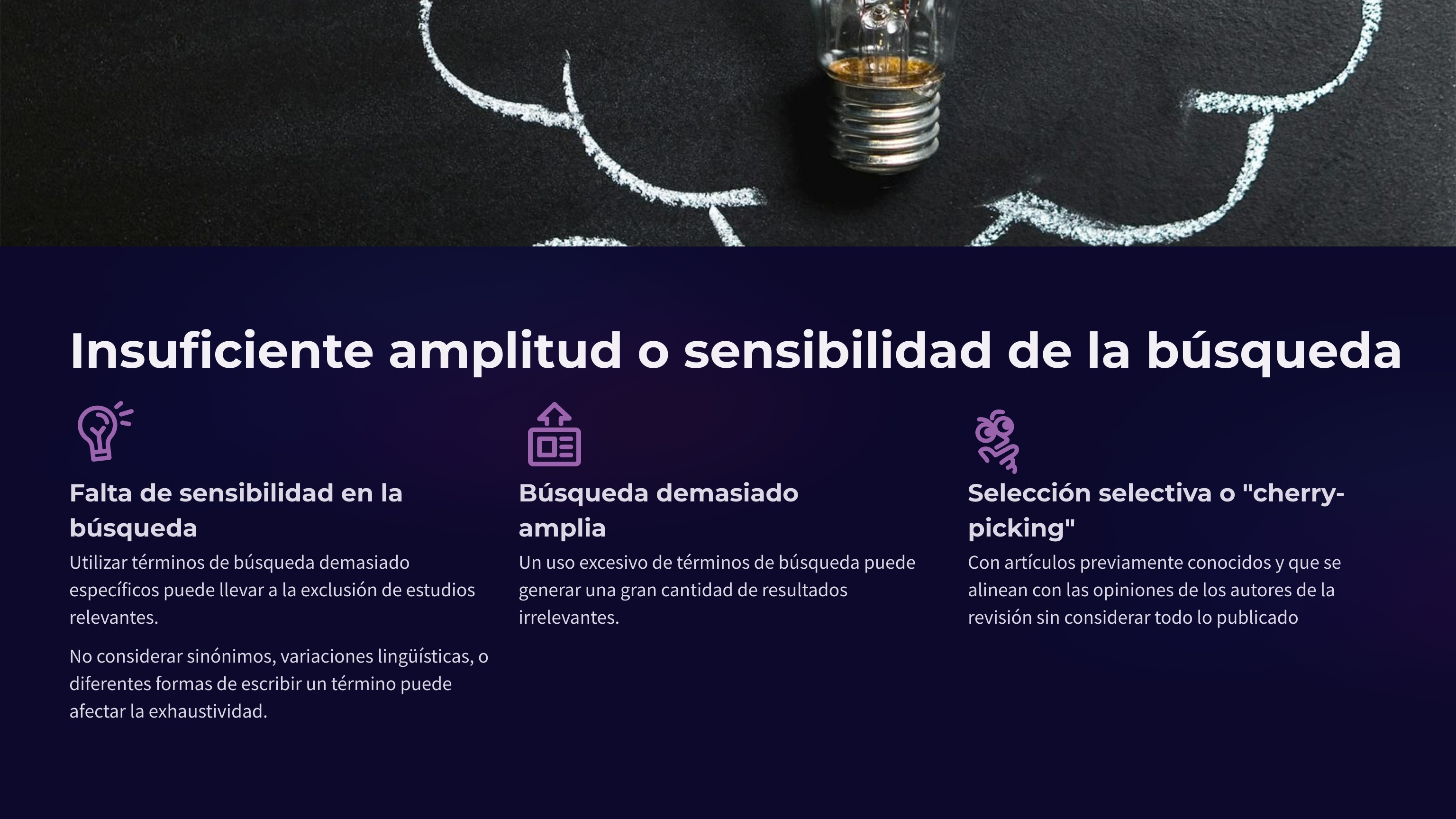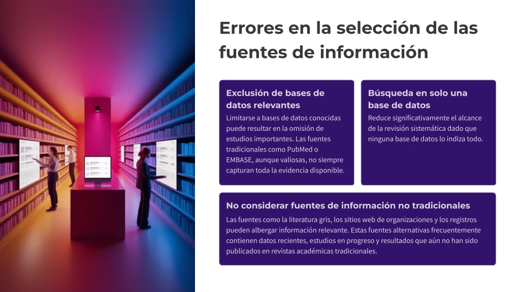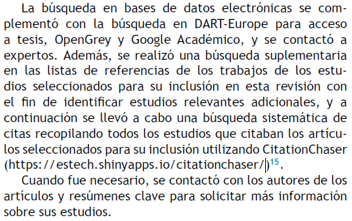 Ampliar la búsqueda más allá de las bases de datos. La inclusión de fuentes como motores de búsqueda, registros de ensayos clínicos, literatura gris, búsqueda complementaria de citas (forward y backward) y el contacto con expertos puede ser clave para identificar estudios que de otro modo pasarían desapercibidos.