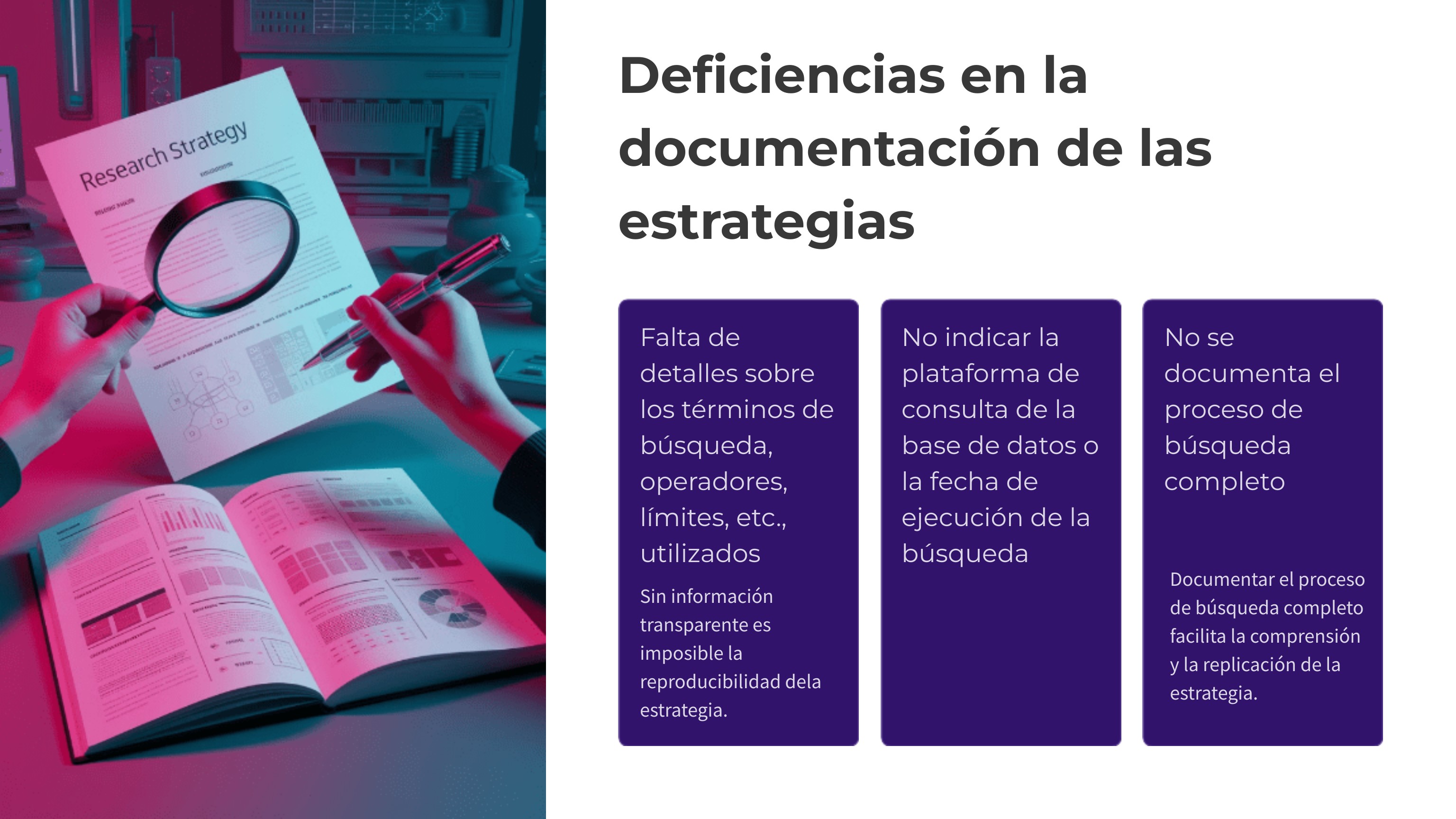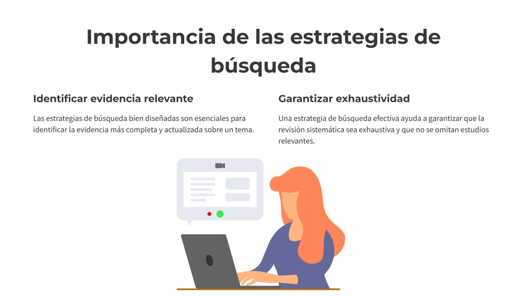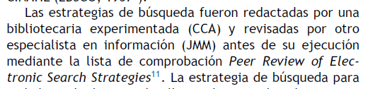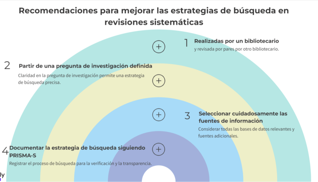 Diseñar una estrategia de búsqueda rigurosa, con la colaboración de un especialista en información. Idealmente, esta estrategia debe ser revisada por pares antes de ser ejecutada (1,4-6). La participación de bibliotecarios especializados en ciencias de la salud en revisiones sistemáticas no es un añadido opcional, sino una práctica recomendada por las principales guías metodológicas (7-9) y respaldada por la evidencia científica (10-11).