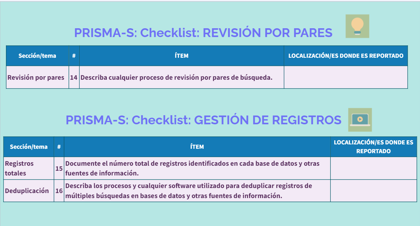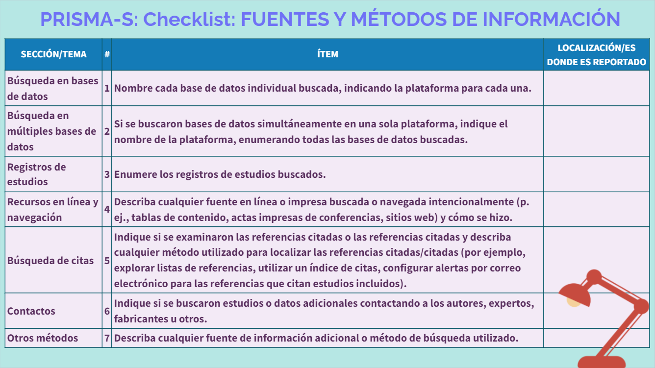 La extensión de PRISMA Search cubre múltiples aspectos del proceso de búsqueda de revisiones sistemáticas, ampliando PRISMA en las cuestiones relacionadas con el informe de la búsqueda de literatura para revisiones sistemáticas y metanálisis. Esta extensión incluye una lista de verificación PRISMA-S, así como su explicación y elaboración y están disponibles en: http://www.prisma-statement.org/Extensions/Searching