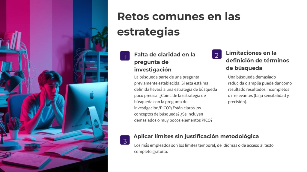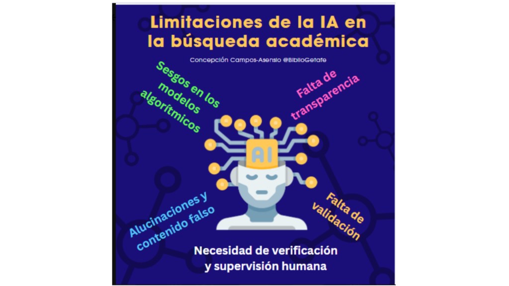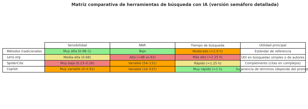 Las herramientas de IA pueden ahorrar tiempo en fases preliminares, generar ideas de términos de búsqueda, identificar autores, pero no deben utilizarse como única estrategia para revisiones sistemáticas si se espera exhaustividad.