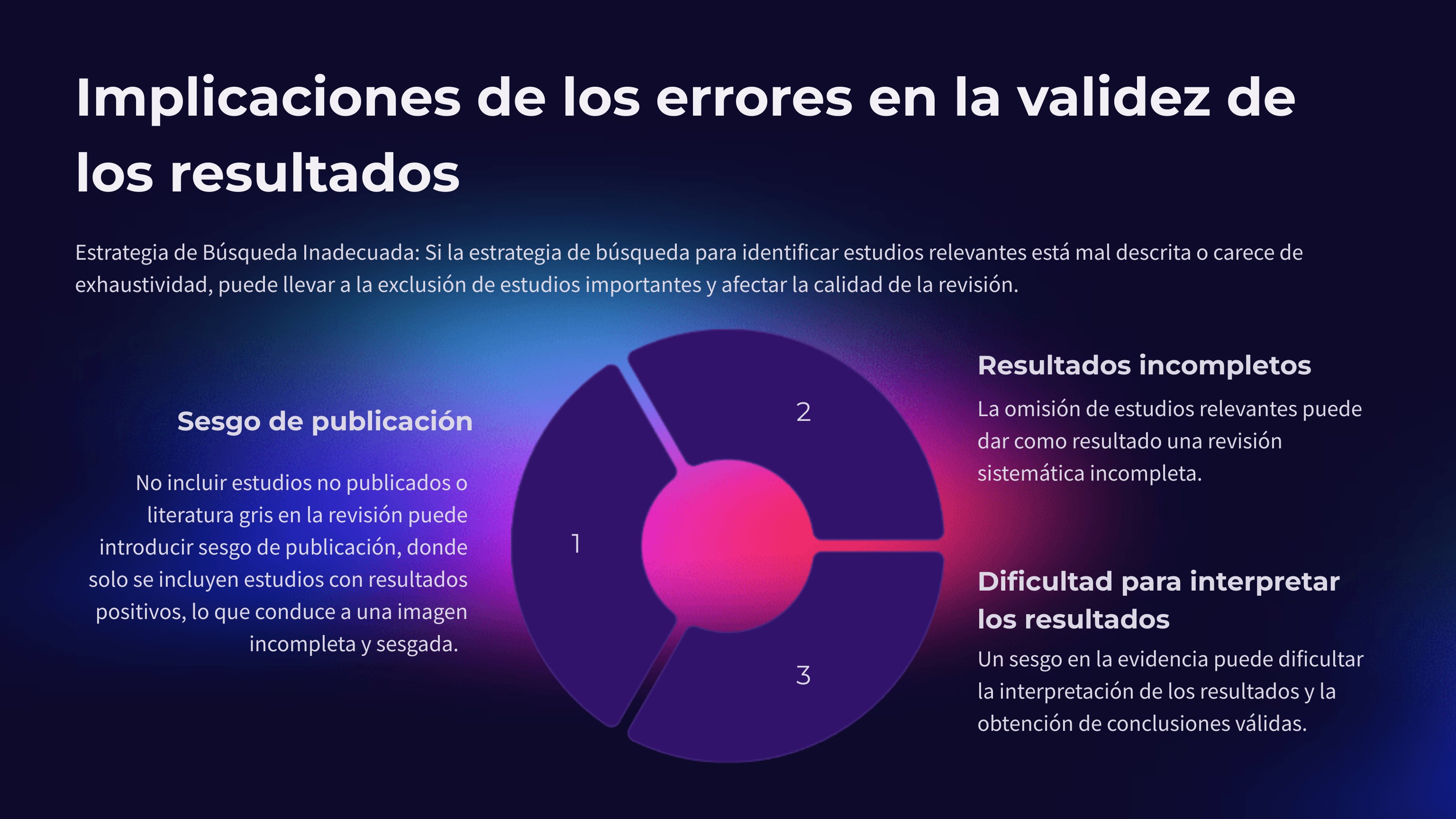 Sesgo de identificación: aparece cuando no se localizan estudios relevantes, a menudo porque la estrategia de búsqueda no es suficientemente sensible o porque no se han explorado todas las fuentes pertinentes. Este tipo de sesgo es especialmente problemático en revisiones sistemáticas que sirven de base para tomar decisiones clínicas, ya que puede comprometer la validez de los resultados.