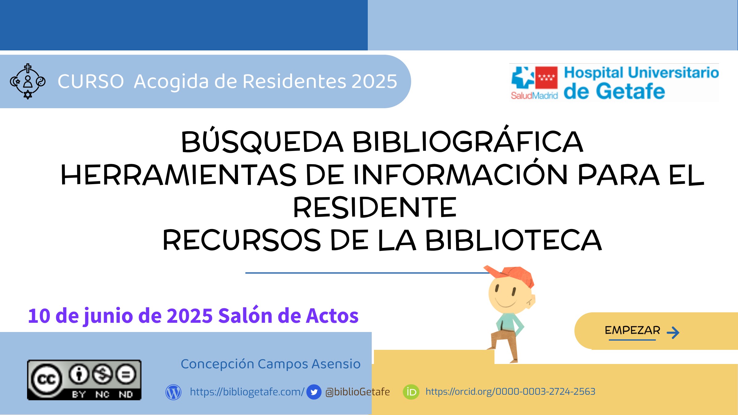 El pasado 10 de junio participé, como cada año, en el curso de acogida y bienvenida a los nuevos residentes del Hospital Universitario de Getafe. Esta intervención, centrada tradicionalmente en los fundamentos de la búsqueda bibliográfica y los recursos de la biblioteca, ha ido evolucionando en los últimos años para dar cabida a los profundos cambios que la inteligencia artificial (IA) está generando en los procesos de búsqueda de información científica.
