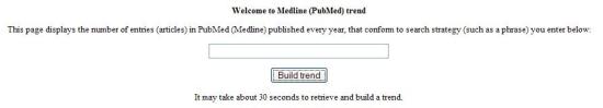 Si dejamos la ventana de búsqueda en blanco y pulsamos el botón «Build trend» el resultado nos mostrará el número de artículos indizados en PubMed cada año.
