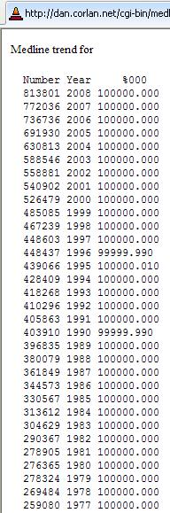 Curiosa página MEDLINE Trends en la que nos muestra como resultado el número de registros (artículos) en PubMed (MEDLINE) publicados cada año.