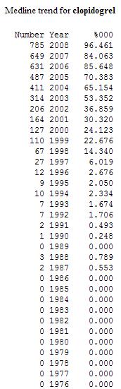 Otra aplicación es para saber «el historial» de lo publicado sobre un tema. Para ello ponemos en la ventana de búsqueda nuestro tema, por ejemplo clopidogrel, y el resultado nos dirá que los primeros artículos sobre este tema aparecieron en 1987, ocasionalmente se publicó en 1996 (12 al año) y que despegó en el 2000.