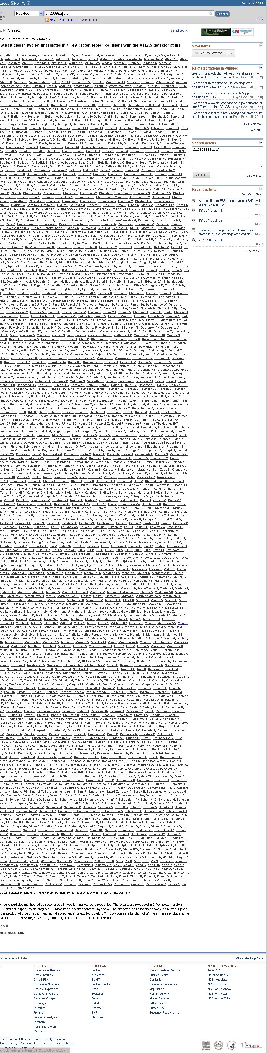 Corresponde a un artículo del año 2010 de la revista Physical Review Letters con PMID 21230962. Aquí os dejo la imagen y, para que no perdáis el tiempo y la vista os adelanto que tiene ¡3.172 autores!. Curiosamente su abstract es de cuatro lineas y de las 19 páginas que ocupa el artículo, el listado de autores comienza en la 5.