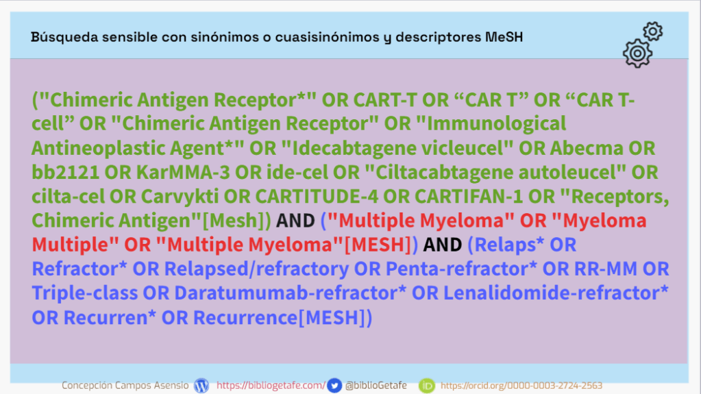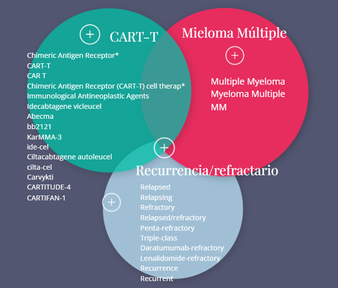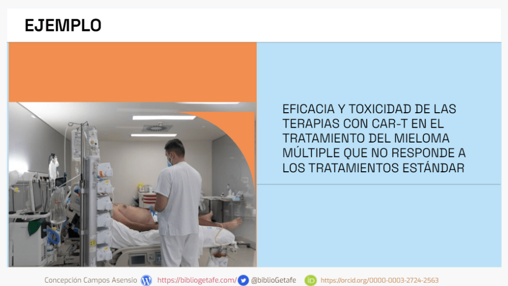 Y para explicarles cómo deben plantearse las estrategias, partiremos de un supuesto práctico que es la búsqueda de estudios sobre eficacia y toxicidad de las terapias CAR-T en el tratamiento del mieloma múltiple refractario con recaídas múltiples.