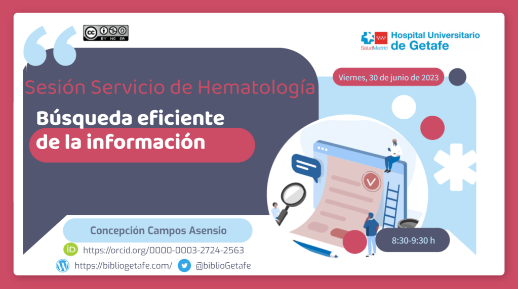 Hoy iré al Servicio de Hematología del Hospital de Getafe a impartir una sesión en la que trataré de aclarar dudas y dar consejos para realizar búsquedas eficientes y de los recursos que tenemos disponibles a través del Portal de la Biblioteca Virtual (https://m-hug.c17.net/).