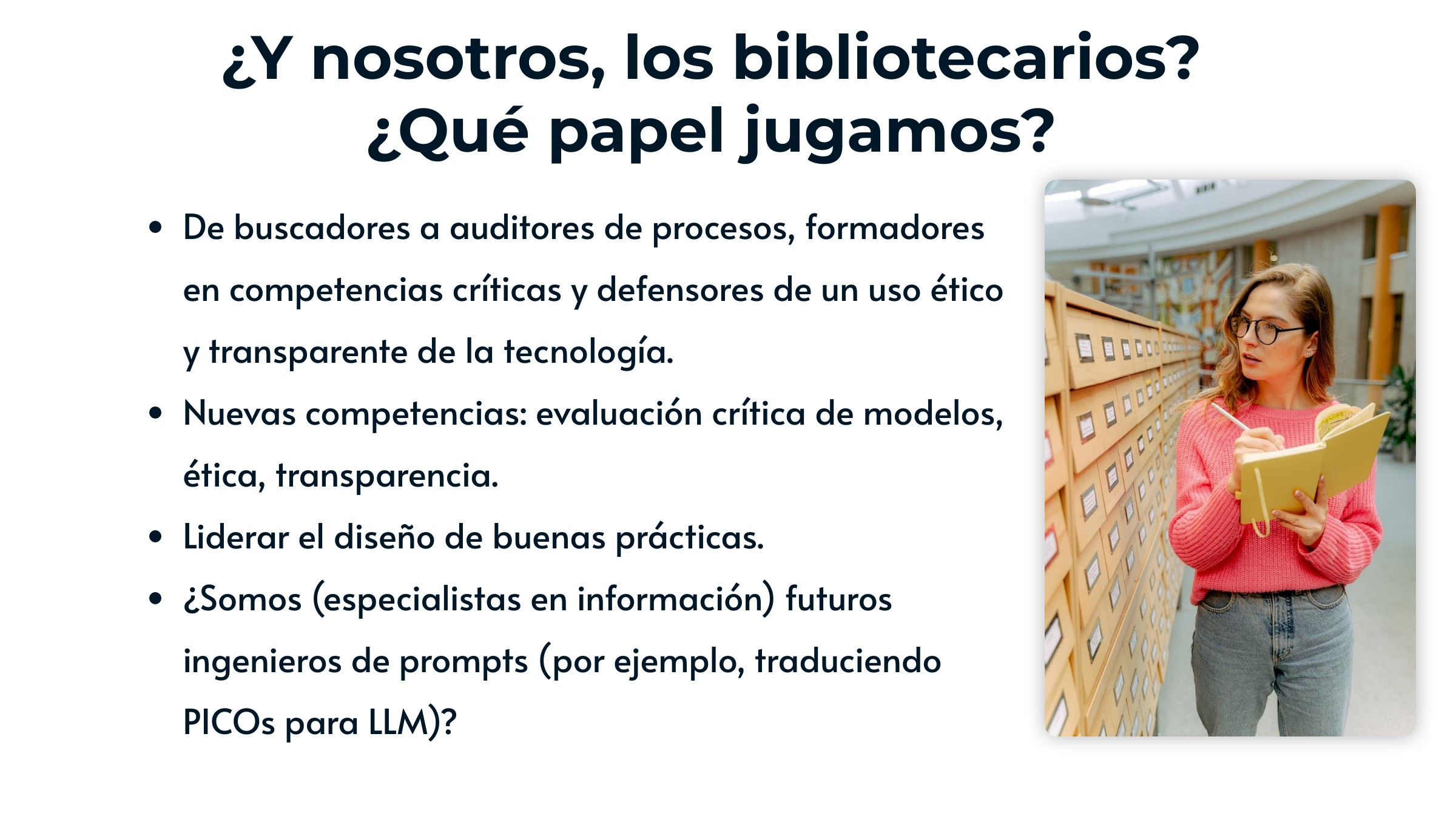 El futuro inmediato no pasa por elegir entre inteligencia artificial o bibliotecario especializado, sino por combinarlos teniendo en cuenta las fortalezas y limitaciones de cada uno de ellos. Cada uno aporta algo diferente y, cuando trabajan juntos, el proceso de búsqueda y revisión gana en velocidad, alcance y rigor.