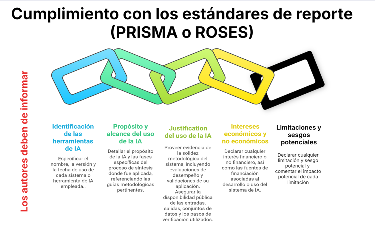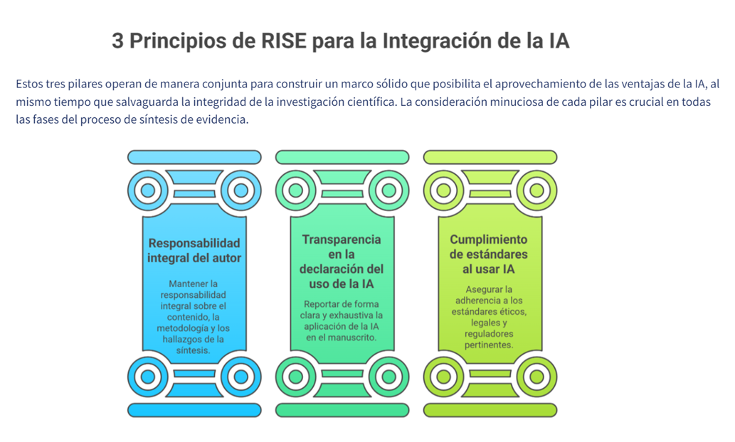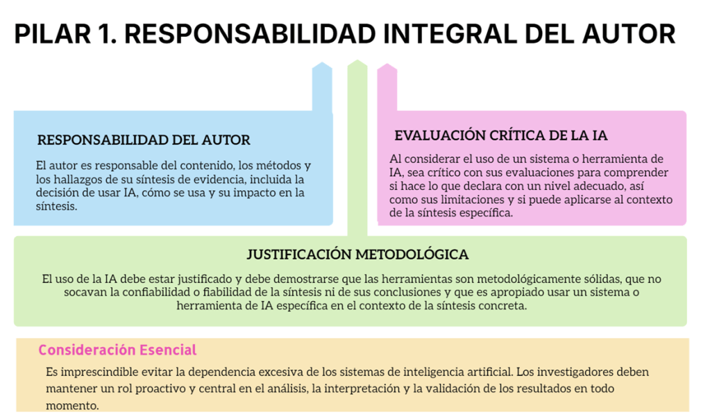 - Tú eres, en última instancia, responsable de su síntesis de la evidencia, incluida la decisión de usar IA y de garantizar la adhesión a las normas legales y éticas.