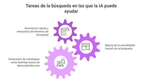 La IA es especialmente útil en las primeras fases del trabajo. Su fortaleza está en generar cantidad: propone términos, sugiere combinaciones, construye borradores de estrategias de búsqueda y automatiza tareas tediosas como adaptar consultas entre plataformas o expandir sinónimos. Es rápida y eficiente para mover grandes volúmenes de información.