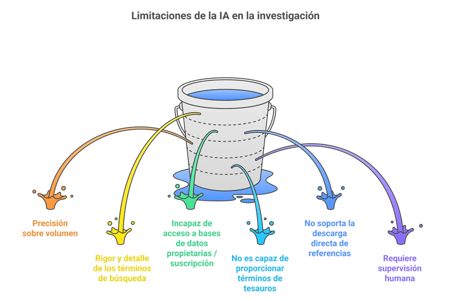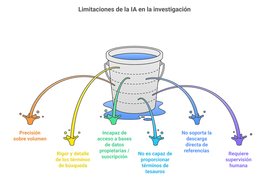 - No puede moverse por tesauros especializados: Al no tener acceso a bases como EMBASE, CINAHL o PsycINFO, la IA no es capaz de navegar por sus tesauros y proponer descriptores correctos. Este es un punto crítico porque las estrategias de búsqueda más sólidas combinan términos libres con términos controlados, y esa fineza todavía no está al alcance de las herramientas generativas.