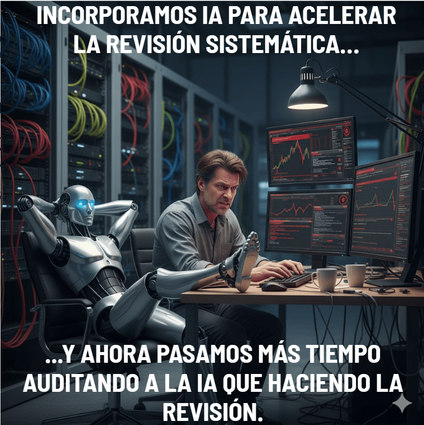 - Siempre necesita supervisión: El uso de IA no elimina la figura del bibliotecario experto ni del equipo de revisión. Más bien cambia su papel: deja de ser quien hace cada paso manualmente para convertirse en quien valida, corrige y toma decisiones informadas. Sin esa supervisión, la IA puede generar estrategias amplias, pero no necesariamente adecuadas.