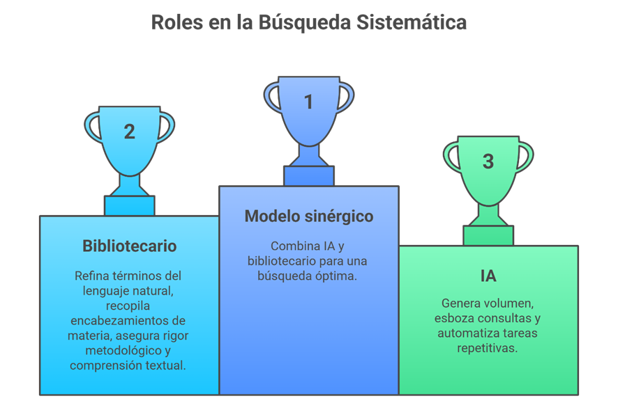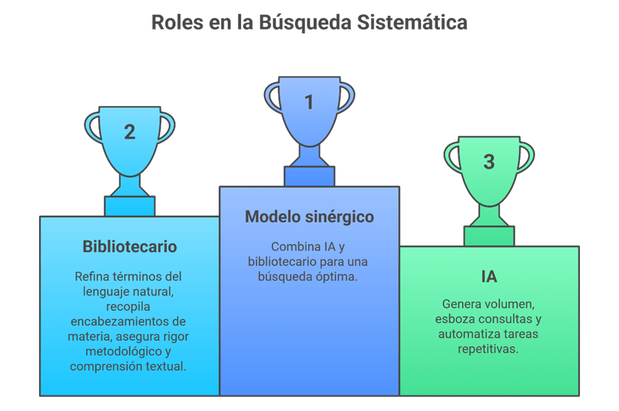 El bibliotecario, por su parte, aporta calidad. No solo afina la terminología y valida los conceptos relevantes, sino que es quien domina el uso de tesauros, entiende la lógica de indexación de cada base de datos y detecta inconsistencias que la IA no ve. Además, garantiza el rigor metodológico: sabe cuándo un término es demasiado amplio, cuándo un operador puede distorsionar la pregunta de investigación y cómo documentar correctamente una estrategia reproducible.