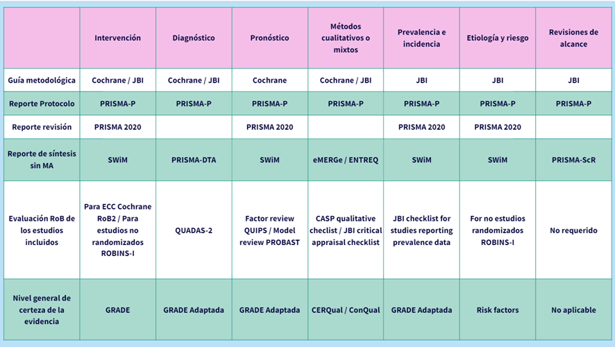 Incluye una tabla con las herramientas que especifican las guías para revisiones sistemáticas con y sin metaanálisis.