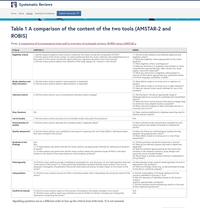 Perry, R., Whitmarsh, A., Leach, V. et al. A comparison of two assessment tools used in overviews of systematic reviews: ROBIS versus AMSTAR-2. Syst Rev10, 273 (2021). https://doi.org/10.1186/s13643-021-01819-x.