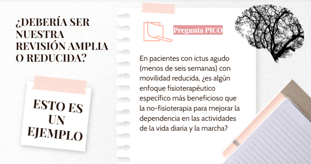 Una revisión amplia sería: En pacientes con accidente cerebrovascular con movilidad reducida, ¿es algún enfoque específico de fisioterapia más beneficioso que ninguna fisioterapia o cualquier otro enfoque de fisioterapia para mejorar la dependencia en las actividades de la vida diaria y la velocidad de desplazamiento?