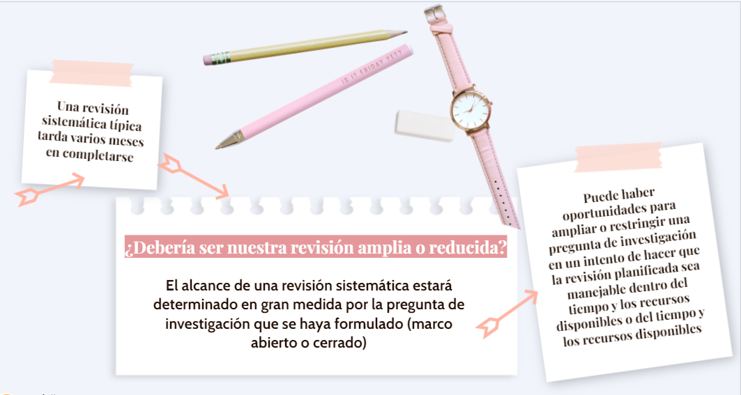 Una revisión sistemática típica tarda varios meses en completarse. Aunque el alcance de una revisión sistemática estará determinado en gran medida por la pregunta de investigación que se haya formulado, puede haber oportunidades para ampliar o restringir una pregunta de investigación en un intento de hacer que la revisión planificada sea manejable dentro del tiempo y los recursos disponibles.