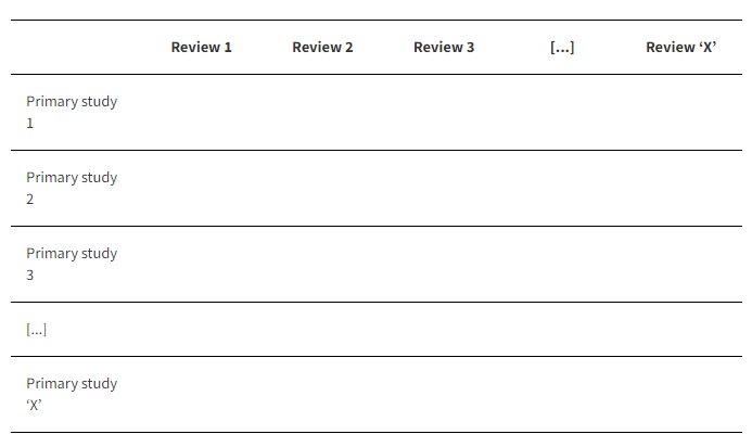 Un paso importante una vez que los autores tienen su lista final de revisiones sistemáticas incluidas es evaluar el solapamiento, es decir, determinar qué estudios primarios están incluidos en qué revisiones sistemáticas.