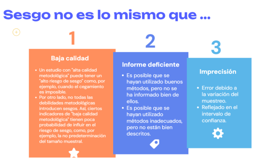 Un estudio con «alta calidad metodológica» puede tener un «alto riesgo de sesgo» como, por ejemplo, cuando el cegamiento es imposible. Por otro lado, no todas las debilidades metodológicas introducen sesgos. Así, ciertos indicadores de «baja calidad metodológica» tienen poca probabilidad de influir en el riesgo de sesgo, como, por ejemplo, la no predeterminación del tamaño muestral.