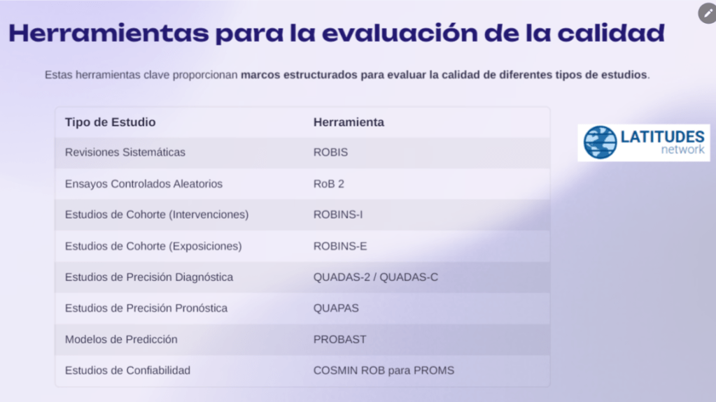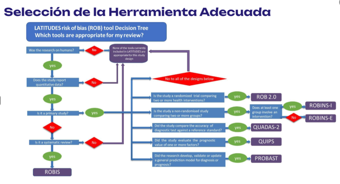 El diagrama de flujo proporcionado por LATITUDES es una guía valiosa en este proceso de selección de la herramienta, pero es importante complementarlo con un conocimiento profundo de las características de cada herramienta y las especificidades del estudio en cuestión. Una selección cuidadosa asegura que todos los aspectos relevantes de la calidad del estudio sean evaluados adecuadamente, fortaleciendo así la validez de la síntesis de evidencia.