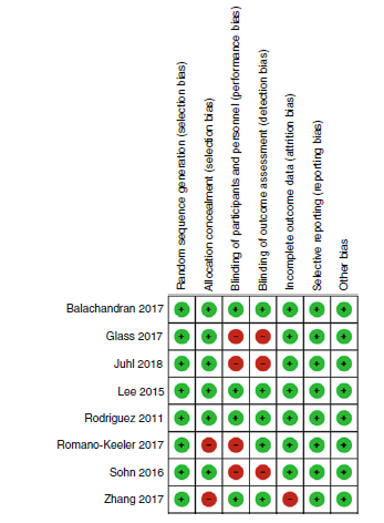El resumen de las evaluaciones del riesgo de sesgo para los estudios incluidos en la revisión sistemática incluye tanto la identificación del estudio como los juicios realizados sobre la posibilidad de que se introduzca el sesgo dentro de cada dominio del instrumento de riesgo de sesgo. En esta figura, los círculos verdes que incluyen un carácter más («+») representan dominios con bajo riesgo de sesgo, mientras que los círculos rojos que incluyen un guión («-«) representan dominios con alto riesgo de sesgo.