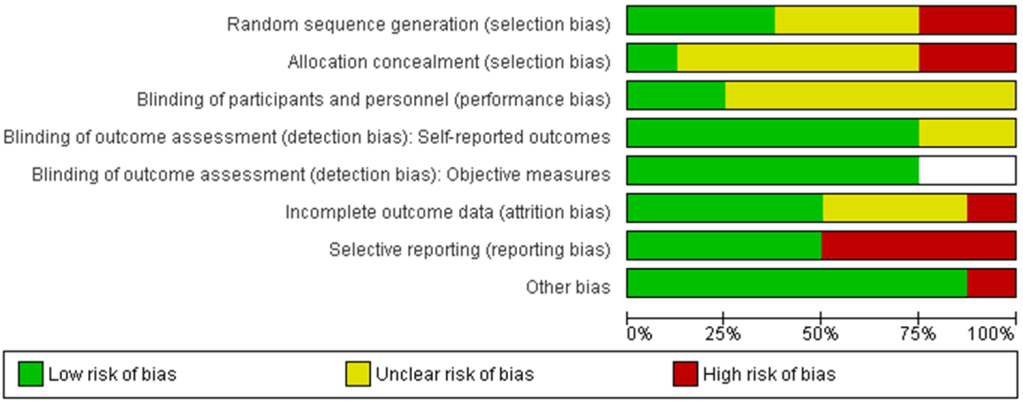 Se ha de resumir el riesgo de sesgo de los estudios incluidos y de cada desenlace. En esta figura se muestra un ejemplo de un resumen de la evaluación del riesgo de sesgo según la herramienta Cochrane de riesgo de sesgo aplicada a 8 ensayos clínicos aleatorizados como parte de una revisión sistemática sobre el calostro humano y bovino para la prevención de la enterocolitis necrotizante.