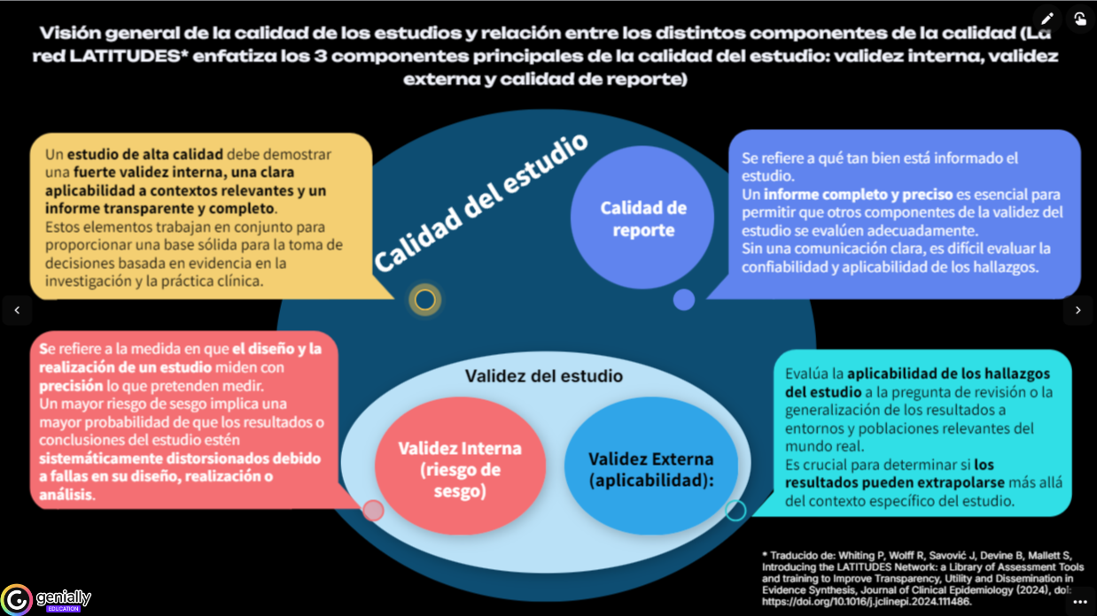 Lared LATITUDES nos proporciona una visión general de la calidad de los estudios y relación entre los distintos componentes de la calidad. Enfatiza los 3 componentes principales de la calidad del estudio: validez interna, validez externa y calidad del informe/reporte.