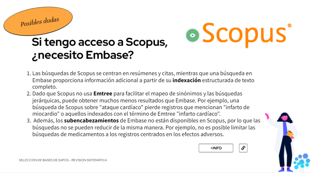 Las búsquedas en Scopus se centran en resúmenes y citas, mientras que una búsqueda en Embase proporciona información adicional a partir de su indexación estructurada de texto completo con el tesauro EMTREE.