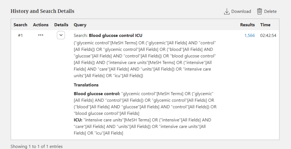 1. Ha separado en dos partes nuestra búsqueda que atiende a los conceptos de control de la glucosa y UCI y aplica entre estos el operador por defecto AND. Además, los busca en todos los campos ([All Fields]) y mediante un algoritmo incluye diferentes combinaciones de sinónimos y variantes.