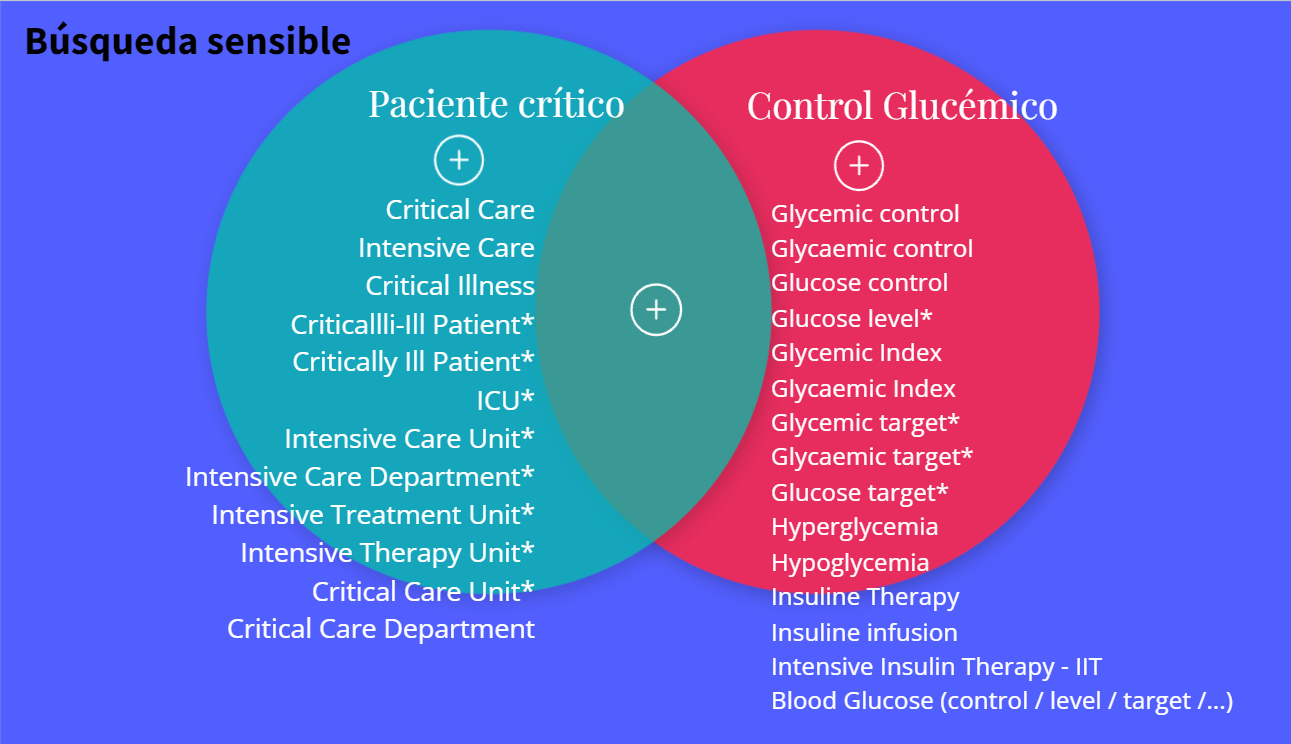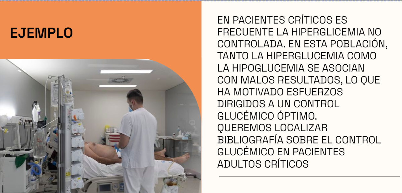 Veamos un ejemplo: queremos buscar bibliografía que compare el control estricto vs. convencional de los niveles de glucosa en sangre en los pacientes ingresados en UCI.