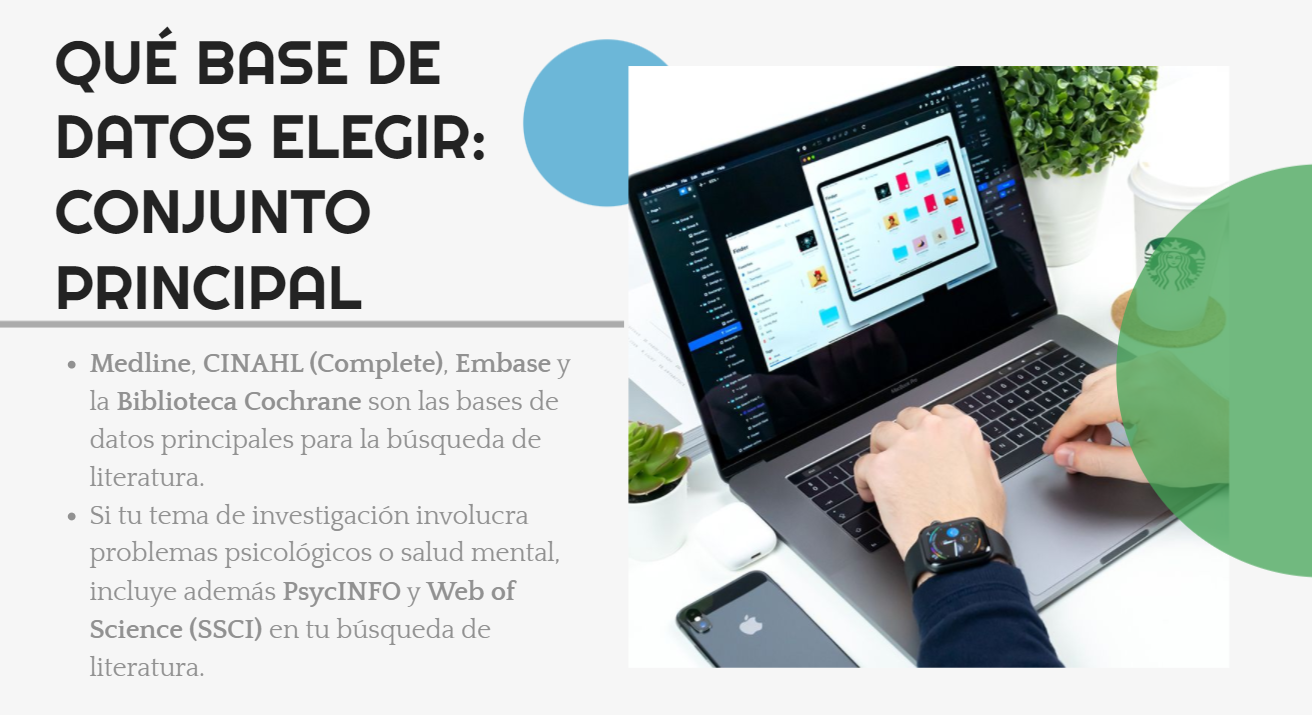 Las bases de datos que utilicemos para localizar la evidencia va a depender del tema de revisión, de la posibilidad de acceso a las bases de datos y el presupuesto disponible para el equipo de revisión, y siempre dentro de la limitación de tiempo. Como norma general, hay que empezar por las fuentes de información que tienen mayor probabilidad de ser más productivas dentro del tema de nuestra revisión, ya que te proporcionarán la mayoría de los estudios. En caso de duda, recomiendo hacer pruebas de búsqueda de nuestro tema de revisión en varias bases de datos y seleccionar las que proporcionen mayores y mejores resultados.