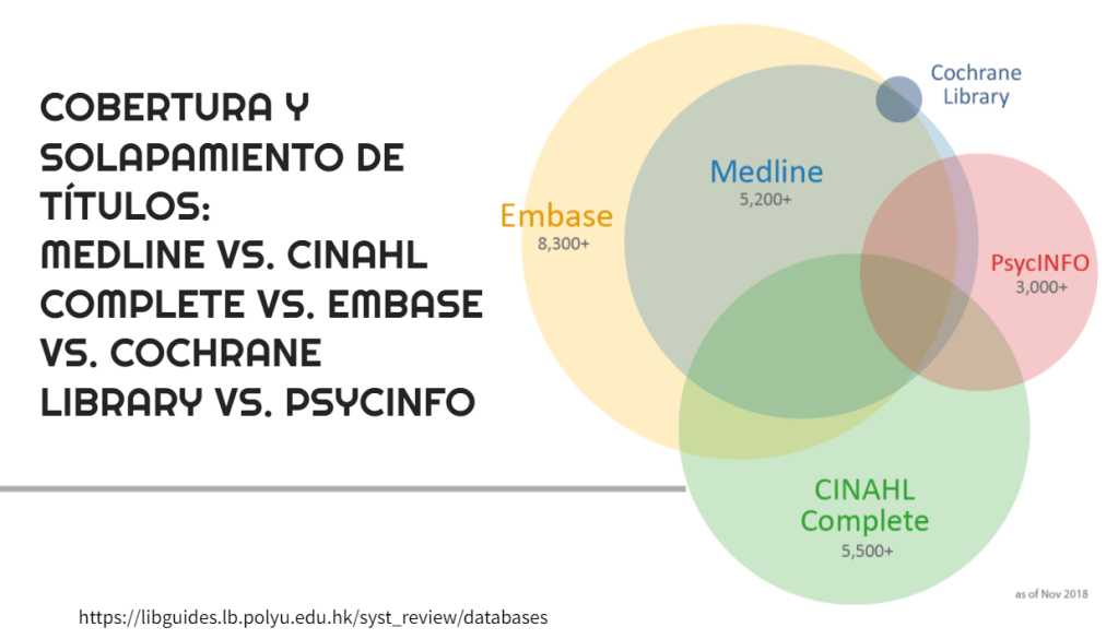 Es importante evaluar la cobertura de cada base de datos para determinar si se están buscando en la fuente adecuada. Además, es importante evaluar el solapamiento entre las bases de datos, aunque hay que tener en cuenta que bastantes estudios van a estar presentes en varias fuentes.